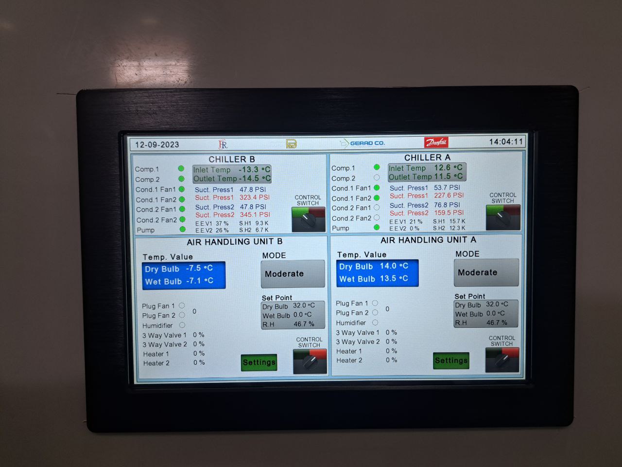 - Precise control of all thermodynamic parameters was another major challenge. Through specialized and accurate programming—covering thermodynamic parameters, coordination between chillers and AHUs, and the required operational accuracy—the system was successfully implemented. Monitoring of four systems was integrated into a single HMI screen to facilitate ease of operation and supervision.